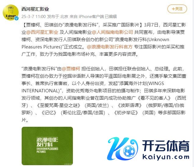 3月7日,西河星汇影业@西河星汇影业及东谈主间指南影业@东谈主间指南电影公司共同文告,由电影导演贾樟柯、资深电影刊行东谈主田祺荟萃创办的新公司“纵欲电影刊行科(UnknownPleasuresPictures)”肃穆培育。@纵欲电影刊行科官方专注国际影片的采买和扩充责任,英敢于为我国电影市集补充、丰富更多本体资源。