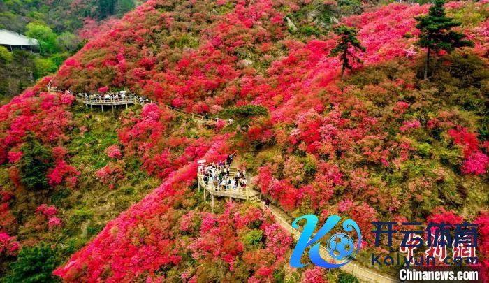 4月4日,游客在杜鹃花海中散步游玩。近日,武汉黄陂木兰涔涔山的杜鹃花海迎来盛花期,蔚为壮不雅。(无东谈主机图片) 中新社记者 张畅 摄