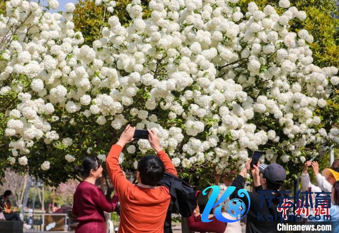 4月2日,游客在湖北武汉沙湖公园拍摄盛开的木绣球。近日,沙湖公园内木绣球迎来盛放期,引得游东谈主如织。中新社记者 张畅 摄