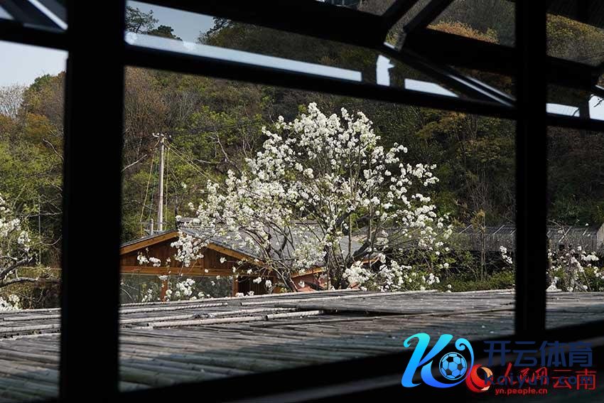 个旧市哨冲村的咖啡馆窗外即是如雪的梨花。东说念主民网记者 蔡树菁摄
