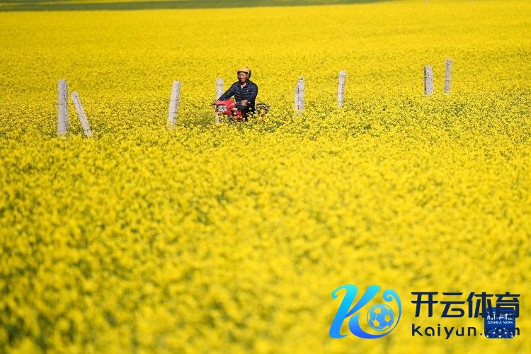 7月3日,在青海省海北藏族自治州门源回族自治县,蜂农骑着摩托穿过油菜花田。