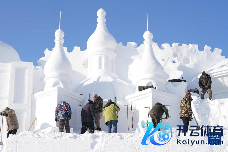 12月18日,雕镂师在哈尔滨太阳岛海外雪雕艺术展览会园内进行大型雪塑创作。