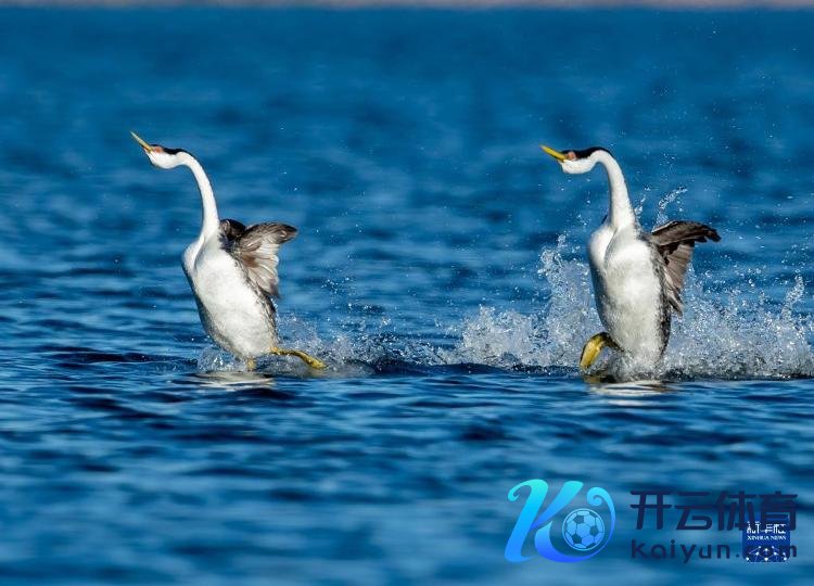 3月8日,在好意思国加州旧金山湾区圣何塞南部一个公园,䴙䴘在水面起舞。