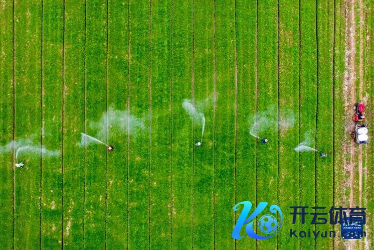 2月16日,安徽省庐江县白湖镇农民在进行小麦病虫害防治功课(无东说念主机像片)。