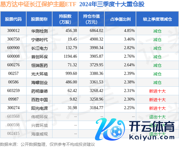 易方达中证长江保护主题ETF为指数型-股票基金,把柄最新一期基金季报流露,该基金钞票设置:股票占净值比99.59%,无债券类钞票,现款占净值比0.31%。基金十大重仓股如下: