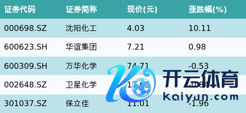 规模收盘开yun体育网,丙烯酸主题涨跌幅最高的五只股票为:沈阳化工(000698.SZ)、华谊集团(600623.SH)、万华化学(600309.SH)、卫星化学(002648.SZ)与保立佳(301037.SZ)。细目见下表: