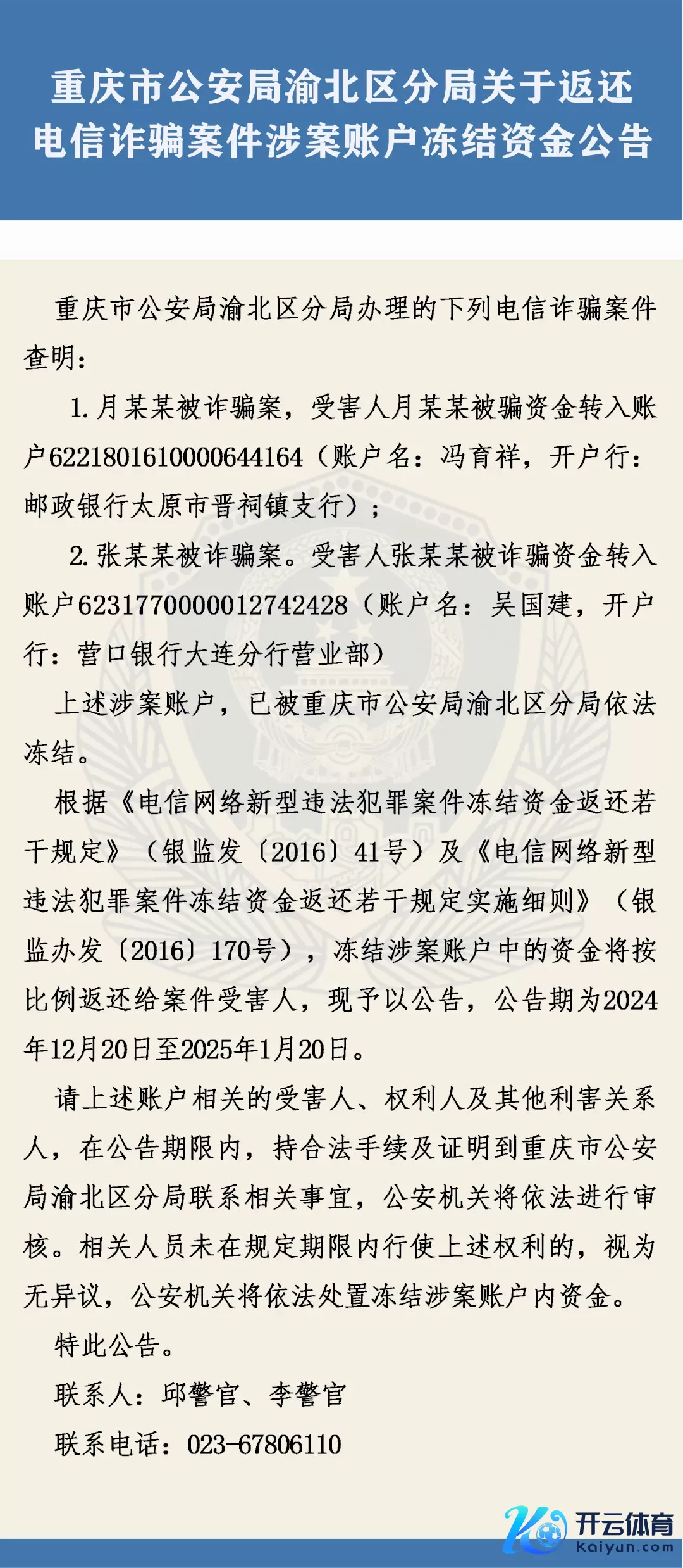开云体育(中国)官方网站重庆市公安局渝北分袂局对于返还电信哄骗案件涉案账户冻结资金公告-开云「中国」kaiyun体育网址-登录入口