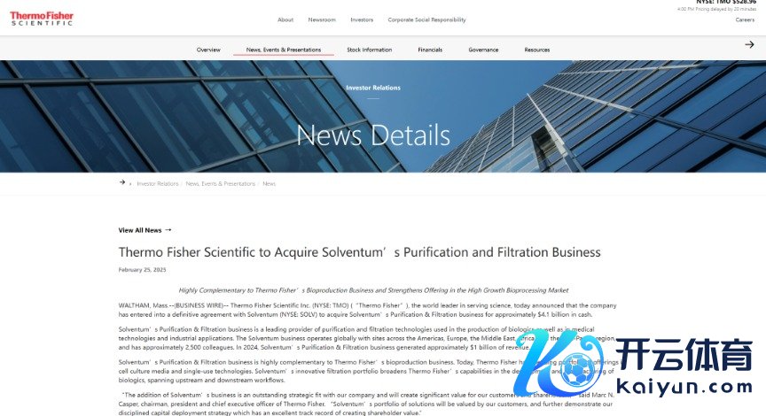 近日,跨国医疗器械公司赛默飞世尔科技(下称“赛默飞”)文牍一笔重磅收购。公司将以41亿好意思元现款收购Solventum的净化与过滤业务。后者是一家于旧年4月从3M剥离出来的医疗保健公司。