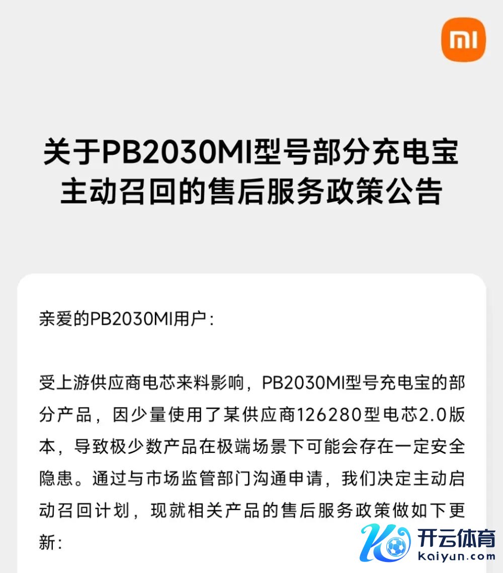 公告理会,受上游供应商电芯来料影响,PB2030MI型号充电宝的部分家具,因少许使用了某供应商126280型电芯2.0版块,导致极少数家具在顶点场景下可能会存在一定安全隐患。通过与市集监管部门交流恳求,决定主动启动调回野心。