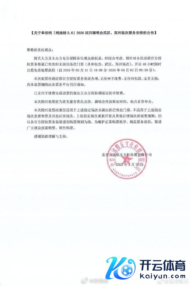 3月30日开yun体育网,单依纯演唱会主持方发声明,称因艺东谈主方及主持方充分保险诸君不雅众的权利,经抽象计议,现针对本次巡演官方授权票务渠谈已售出但未献技场次门票,开启48小时限时自觉免责退票历程,全文如下: