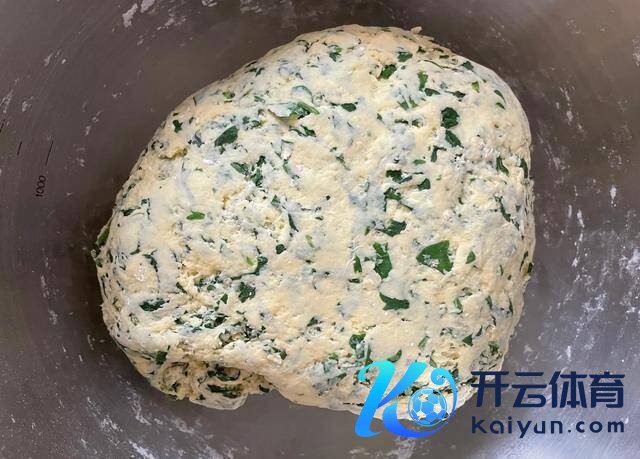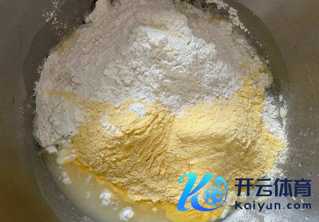 2. 玉米面、白面、小苏打放入盆中,加少许盐拌匀,放入芹菜叶碎;