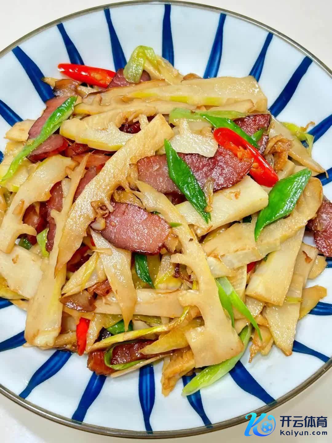 02 春笋炒腊肉✅ 亮点:春笋炒腊肉,是春天与冬天的风姿碰撞。春笋此时正水灵,富含膳食纤维与钾元素,能助消化、清春燥;腊肉提供脂肪与卵白质,咸香甘醇。口感上,笋片率直清甜,吸饱腊肉的油脂后更润口,腊肉角落焦香、肥而不腻。一脆一软,咸鲜回甘。